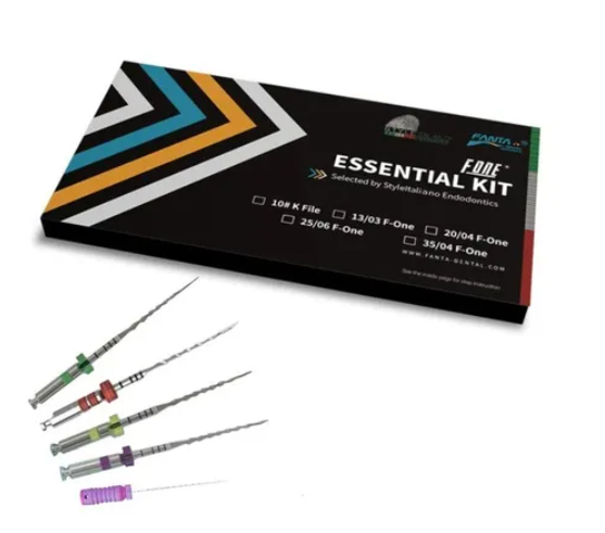 F-ONE ESSENTIAL KIT (#10 K file, F ONE: 03/13, 04/20, 06/25, 04/35), 21mm, 5pcs/box – Fanta Dental is a premium endodontic instrument kit designed for precise and efficient root canal preparation. Engineered for durability and optimal cutting efficiency, it ensures smooth canal shaping while minimizing procedural errors. Ideal for both general and complex endodontic cases.